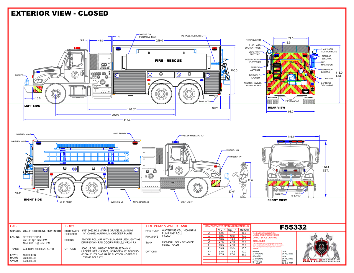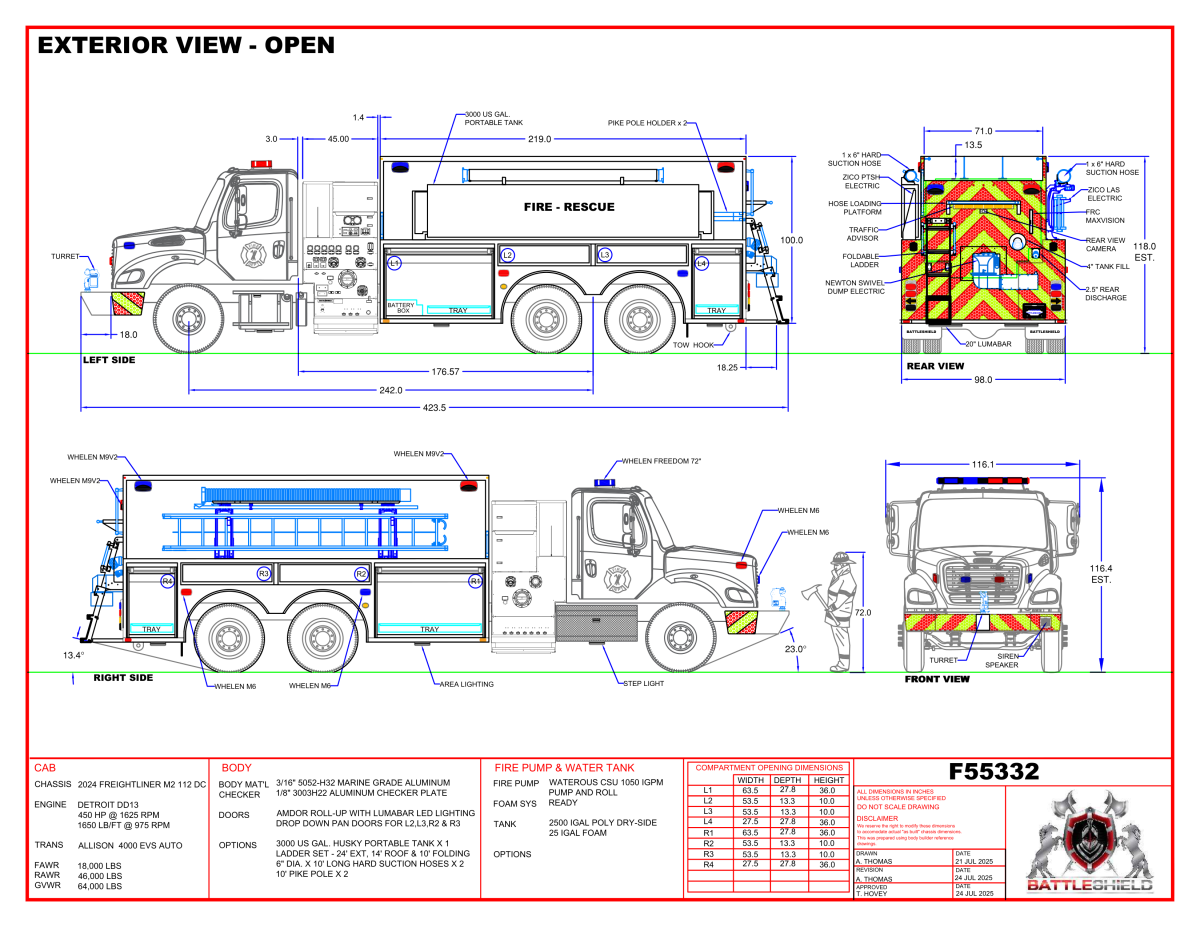 • Driver side – Two 2 ½” w/ CSA fittings, two crosslay 1 ¾” w/ Chicksan fittings.